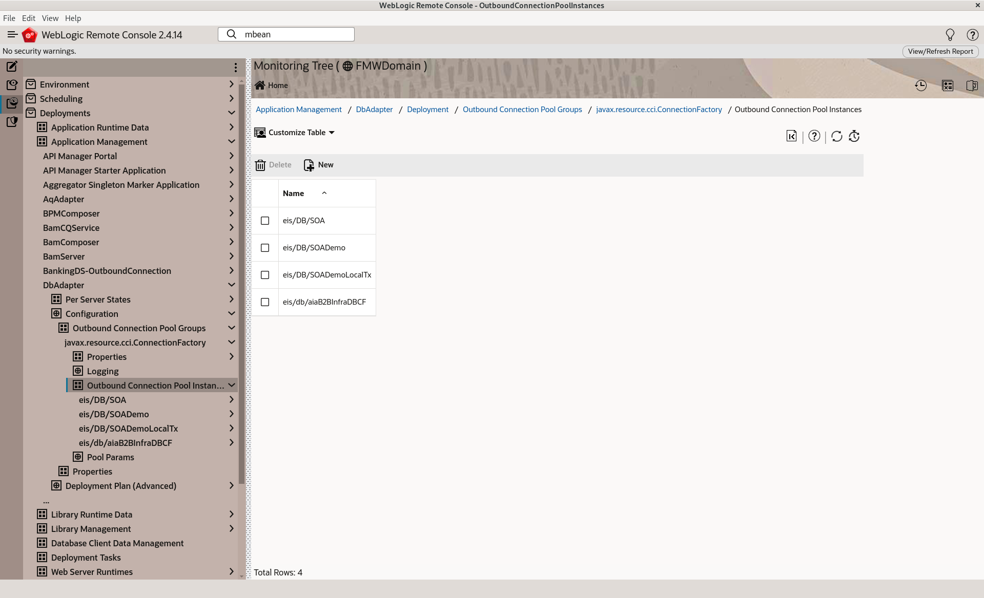 Navigate Remote Console to add Outbound Connection Pool instance: Monitoring Tree > Deployment > Application Management > DbAdapter > Configuration > Outbound Connection Pool Groups